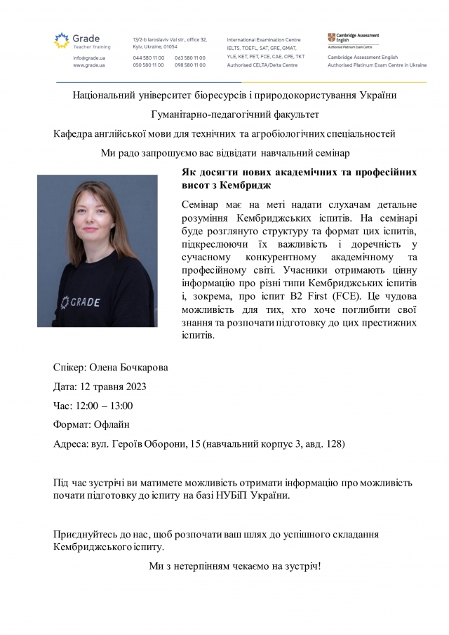 Кафедра англійської мови для технічних та агробіологічних спеціальностей запрошує відвідати навчальний семінар "Як досягти нових академічних та професійних висот з Кембридж" 12 травня 2023 року 03:00 - 03:00