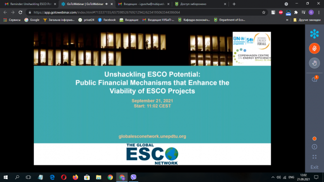 Кафедра економічної теорії НУБіП України 21.09.2021 року прийняла участь у вебанарі "Unshackling ESCO Potential: Public Financial Mechanisms that Enhance the Viability of ESCO Projects".