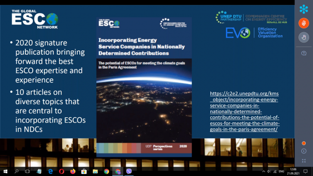 Кафедра економічної теорії НУБіП України 21.09.2021 року приняла участь у вебанарі "Unshackling ESCO Potential: Public Financial Mechanisms that Enhance the Viability of ESCO Projects". Вебінар провидили UNEP DTU Partnership The Global ESC NetWork , компанії енергосервісу (ESCO) – це глобальна мережа, яка збирає асоціації ESCO у всьому світі, а також міжнародні установи та експертів ESCO з метою просування ESCO та укладання контрактів на енергоефективність у відповідь на глобальну проблему зміни клімату та цілі, визначені Паризькою угодою. ESCO впроваджує бізнес-модель, яка безпосередньо відповідає на глобальну проблему зміни клімату. У сфері зміни клімату ESCO забезпечують найкращі прибутки від інвестицій, зменшуючи споживання енергії, одночасно борючись із надлишковими викидами парникових газів як значною спільною вигодою.