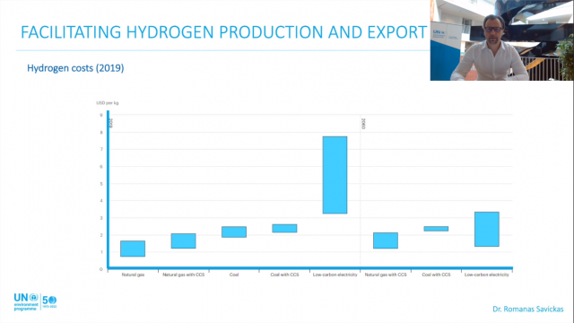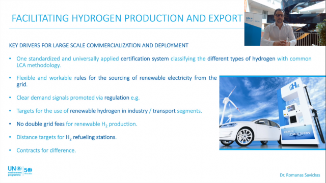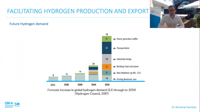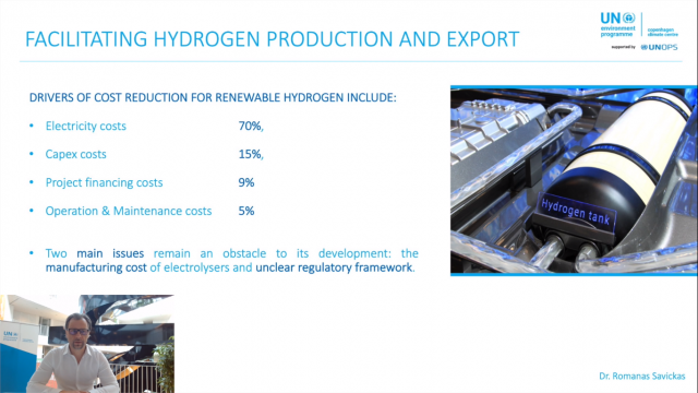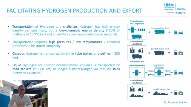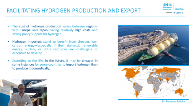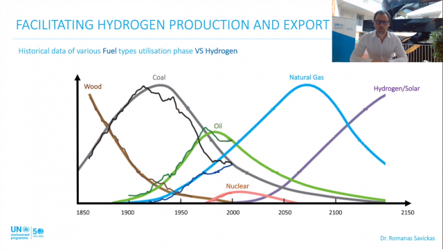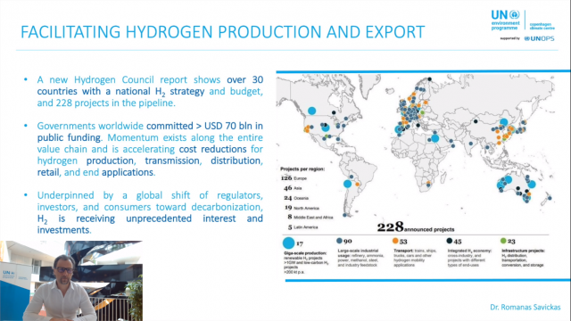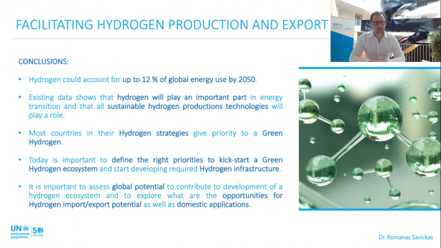 Під час вебінару д-р Романас Савіцкас ознайомив з корінням та історією розвитку водню, порівнянням і потенціалом водню з іншими видами палива, властивостями водню та пов’язаними з цим питаннями транспортування та потенційними можливостями, витратами на ринку водню та майбутніми тенденціями, водневими стратегіями різних країн, глобальною картою попиту та пропозиції на водень, глобальним потенціалом імпорту/експорту водню, також відбулося обговорення щодо сприяння виробництву та експорту/імпорту зеленого водню.