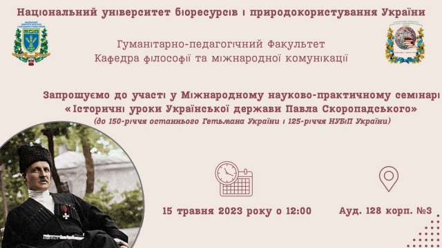 Кафедра філософії та міжнародної комунікації НУБІП України запрошує взяти участь у Міжнародному науково-практичному семінарі "Історичні уроки Української держави Павла Скоропадського" (до 150-річчя останнього Гетьмана України і 125-річчя НУБіП України)