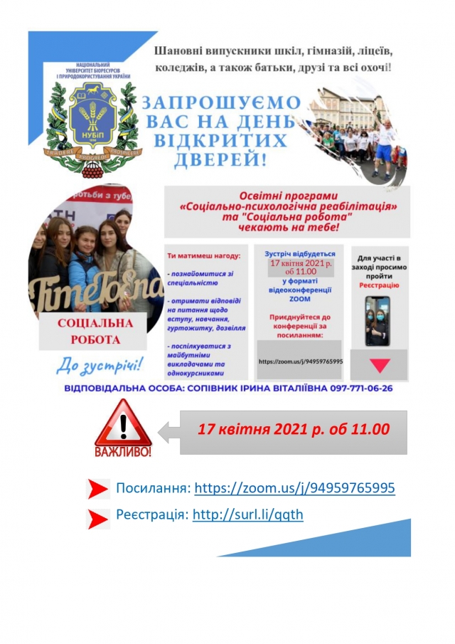 Кафедра соціальної роботи та реабілітації запрошує всіх бажаючих на День відкритих дверей! Посилання: https://zoom.us/j/94959765995 Ідентифікатор конференції: 949 5976 5995 16 квітня 2021 року 03:00 - 03:00