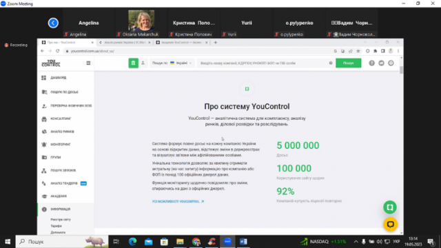 19 травня 2023 р. викладачі та аспіранти кафедри статистики та економічного аналізу прийняли участь у вебінарі української компанії ТЗоВ «Ю-Контрол», яка створює сучасні сервіси для аналізу підприємств. До зустрічі долучилися також студенти ОПП «Аналітичне та обліково-правове забезпечення бізнесу», які мали нагоду познайомитися із інструментами даної фірми для аналізу компаній та фізичних осіб, що сприятиме їх практико орієнтованому навчанню і реалізації компетентнісного підходу.