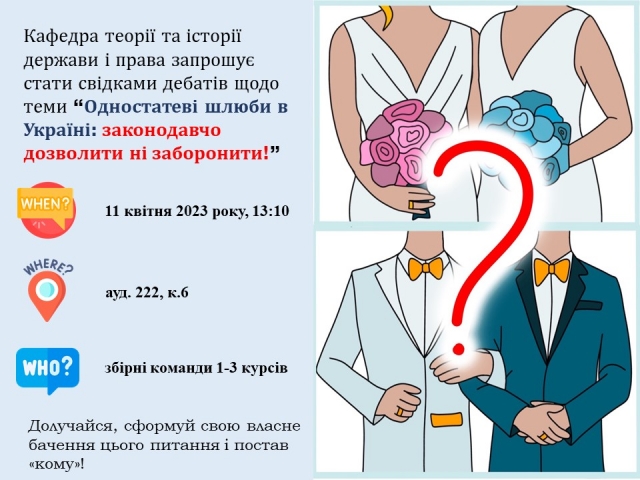 Кафедра теорії та історії держави і права запрошує на дебати щодо теми “Одностатеві шлюби в Україні: законодавчо дозволити ні заборонити!” 9 квітня 2023 року 03:00 - 03:00