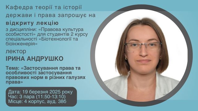Кафедра теорії та історії держави і права запрошує на відкриту лекцію з навчальної дисципліни «Правова культура особистості» для студентів 2 курсу спеціальності «Біотехнології та біоінженерія» 15 березня 2025 року 02:00 - 02:00