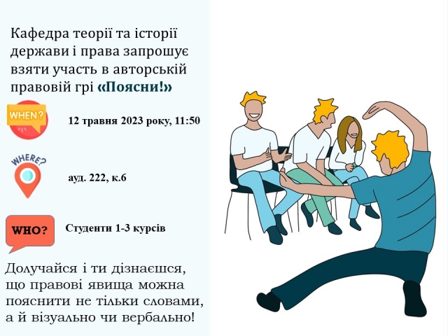 Кафедра теорії та історії держави і права запрошує взяти участь в авторській правовій грі «Поясни!» 11 травня 2023 року 03:00 - 03:00
