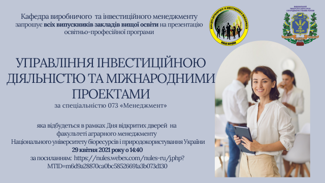 Кафедра виробничого та інвестиційного менеджменту гостинно запрошує Вас 29 квітня 2021 року відвідати on-line День відкритих дверей на факультеті аграрного менеджменту Національного університету біоресурсів і природокористування України