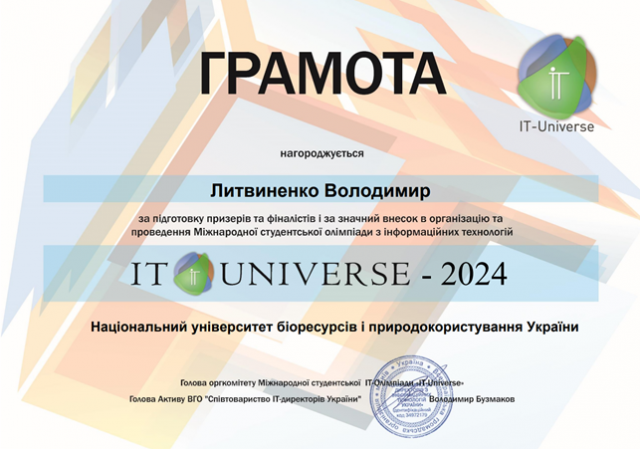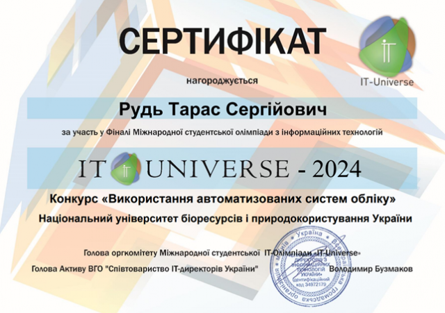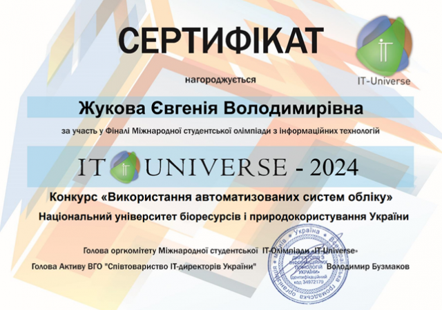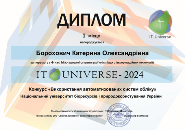 Поєднавши всі здобуті знання в університеті та на курсах я змогла вибороти перше місце в студентській олімпіаді IT-Universe, за що завдячую всім викладача, а особливо викладачу дисципліни «Бухгалтерський облік в прикладних програмних рішеннях», завідувачу кафедри обліку та оподаткування Володимиру Сергійовичу Литвиненку". Вітаємо Катерину БОРОХОВИЧ і її наукового керівника з перемогою на олімпіаді. Бажаємо усім здобувачам подальших успіхів у здобутті знань та самореалізації в професії. Хай вам щастить!