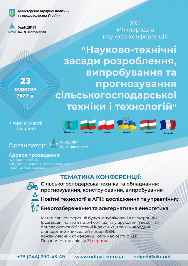 ХХІІ Міжнародна наукова конференція "Науково-технічні засади розроблення, випробування та прогнозування сільськогосподарської техніки і технологій" Реєстраційна форма (word) Вимоги до матеріалів (word) Іван Роговський 2 серпня 2022 року 03:00 - 03:00