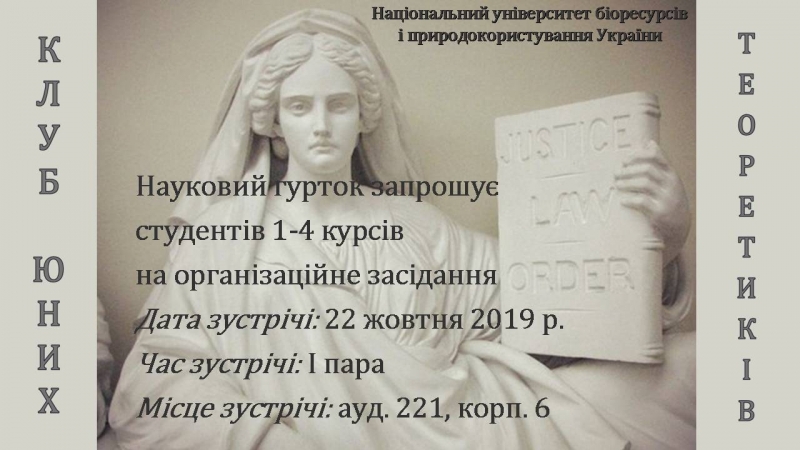 Науковий гурток «Клуб юних теоретиків» готовий розпочати свою роботу. Запрошую студентів 1-4 курсів стати учасниками цієї маленької наукової спільноти. Для Вас буде відкрито шлях до пізнання усього того про право та державу, що залишилося поза межами лекційних курсів і є предметом не навчальної дисципліни, а науки, наблизитися до «вічності» і залишити свій слід у науковій теоретико-правовій діяльності.