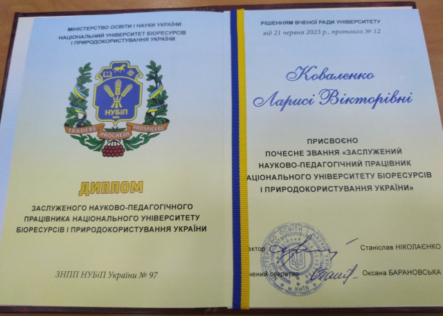 Рішенням Вченої ради університету Коваленко Ларисі Вікторівні присвоєно почесне звання заслуженого науково - педагогічного працівника НУБіП України!