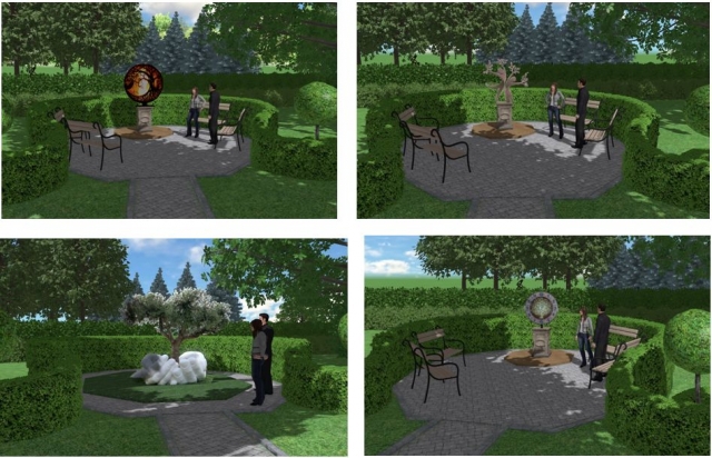 На вимогу сучасності та керівництва ННІ лісового і садово-паркового господарства співробітниками кафедри ландшафтної архітектури та фітодизайну проведено проектний пошук та розробку майбутньої композиції біля першого навчального корпусу НУБіП України із максимальним врахуванням вихідної ситуації, місцерозташуванням деревних видів рослин та існуючої доріжки. До розгляду представлено чотири варіанти скульптурного оформлення, що виконуватиме композиційний акцент.