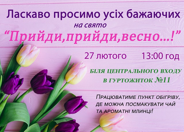 Вас пригощатимуть гарячим чаєм, ароматними млинцями з різноманітними начинками, проведуть традиційні тематичні забави, конкурси, для дітей розваги, маленькі поні та святковий концерт «Прийди, прийди весно…!»