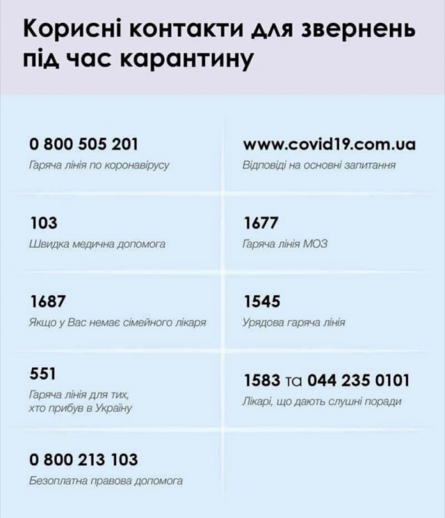 КОРИСНІ КОНТАКТИ ДЛЯ ЗВЕРНЕННЯ ПІД ЧАС КАРАНТИНУ