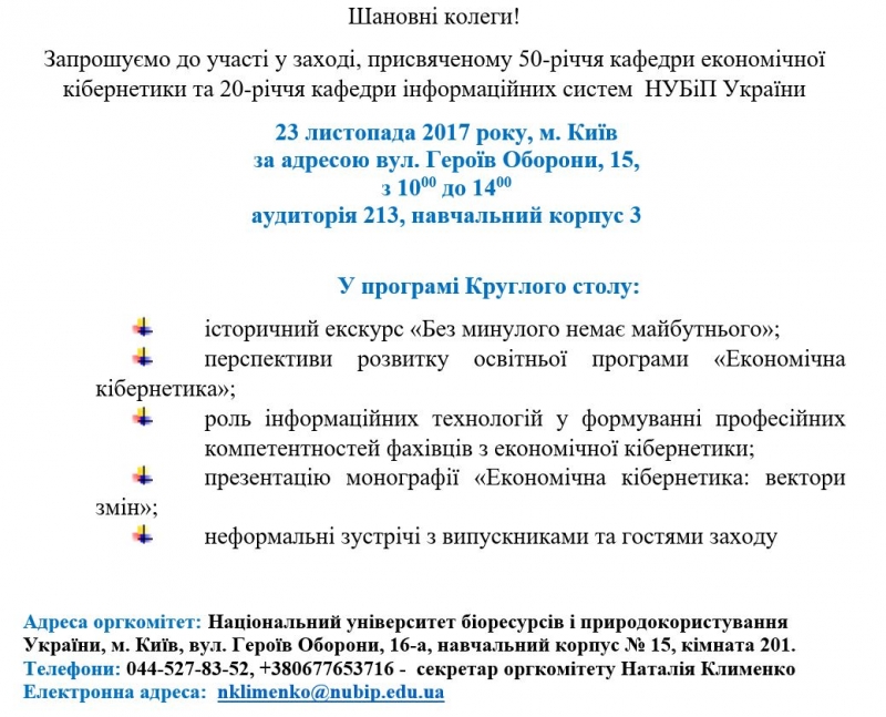 КРУГЛИЙ СТІЛ «ЕКОНОМІЧНА КІБЕРНЕТИКА: ВЕКТОРИ ЗМІН» Електронна адреса: [email protected] Програма заходу: за посиланням 23 листопада 2017 року 02:00 - 02:00