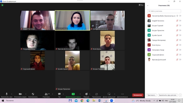 Хоч на онлайн-зустріч під‘єднатися змогли не всі, через часті вимкнення електроенергії, але з частиною студентів вдалося обговорити важливі питання навчального процесу. З’ясували результати атестації, готовність студентів до сесії та навчання в умовах можливих блекуатів. Частина студентів проживає в гуртожитку,тому важливо було обговорити умови проживання у важкий для всіх час і за можливості - вирішити хвилюючі проблеми.