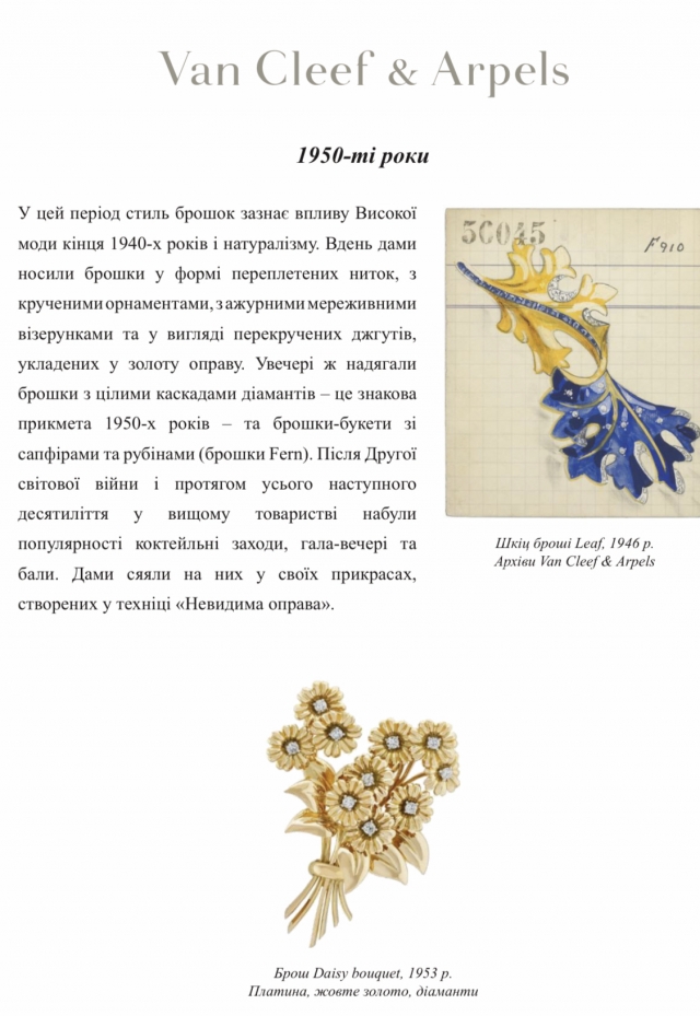 На художніх полотнах, починаючи з епохи Відродження, зображувалися французькі королі та королеви у шатах, оздоблених ювелірними прикрасами, створеними під враженням від текстури найрізноманітніших тканин. З дня заснування Дому Van Cleef & Arpels його майстрів надихали ці шедеври і їх неповторна французька витонченість. Типові брошки того часу мали форму стилізованих стрічок, різноманітних завитків, закручених орнаментів, віял та бантів. Вони були всуціль всипані діамантами, сяйво яких підкреслювалося насиченим кольором рубінів або сапфірів. Завдяки платиновій оправі вони були порівняно легкими, тому їх сміливо кріпили на повітряні вишукані тканини, з яких тогочасні кутюр’є так полюбляли створювати вечірнє вбрання. У 1930-х роках – у період інтенсивних досліджень та розробок – Дім упровадив низку суттєвих іновацій. У 1933 році було зареєстровано патент на техніку закріплення «Невидима оправа»TM, яка дозволяла приховати метал, вигідно подаючи кольорові коштовні камені. Побачити унікальну історичну колекцію можна у Києві, виставка Van Cleef & Arpels «Art of Clip»у Національному художньому музеї України