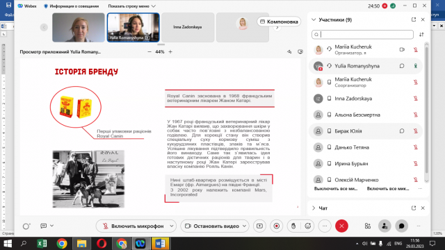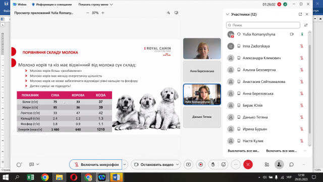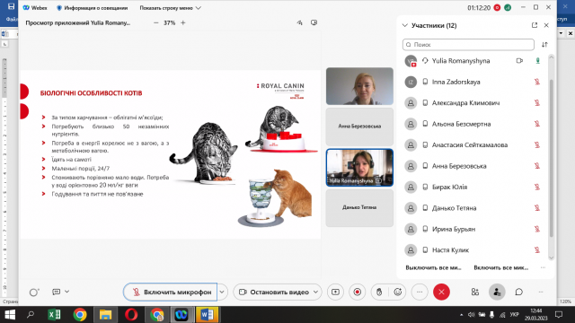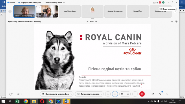 Питання гігієни годівлі собак і котів висвітлила на лекції, на запрошення завідувача кафедри ветеринарної гігієни імені професора А.К.Скороходька Кучерук Марії, експерт, член Європейського товариства ветеринарної і порівняльної дієтології (ESVCN) Романишина Юлія, представник всесвітньо відомої компанії Royal Canin, що займається виготовленням повнораціонних і дієтичних (лікувальних) кормів для котів та собак.