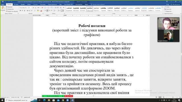 Структура і логіка заняття дотримані. У ході розповіді матеріалу студент-практикант ставив питання. На занятті було використано програму ZOOM, так як навчання проходить дистанційно. Була показана презентація до заняття. Вона була оформлена добре.