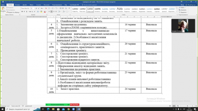 В перший день керівниками практики була проведена настановча конференція на платформі ZOOM, на якій був предений інструктаж, розяснені завдання практики, надані методичні рекомендації студентам з приводу завдань практики, оформлення щоденника, звіту та індивідуального графіку. Зі старостами та студентами були зроблені напередодні в Telegram та Viber групи, де була надана вся інформація, яку потрібно обробити.