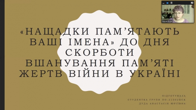 В понеділок 20.06.2022 року студентами було проведено заняття:«Нащадки пам’ятають ваші імена» до Дня скорботи вшанування пам’яті жертв війни в Україні. Мета заняття: виховувати почуття патріотизму, мужність, любов до Батьківщини, повагу до свого народу, людяність, чуйність.