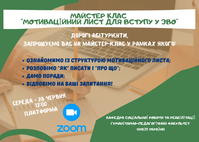 Запрошуємо Вас на безкоштовний майстер-клас із написання мотиваційного листа у середу 28 червня 2023 року о 12.00 в онлайн форматі.