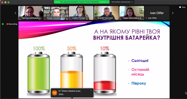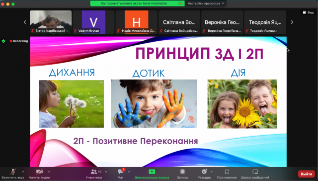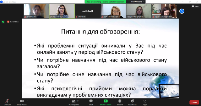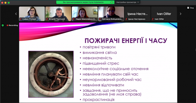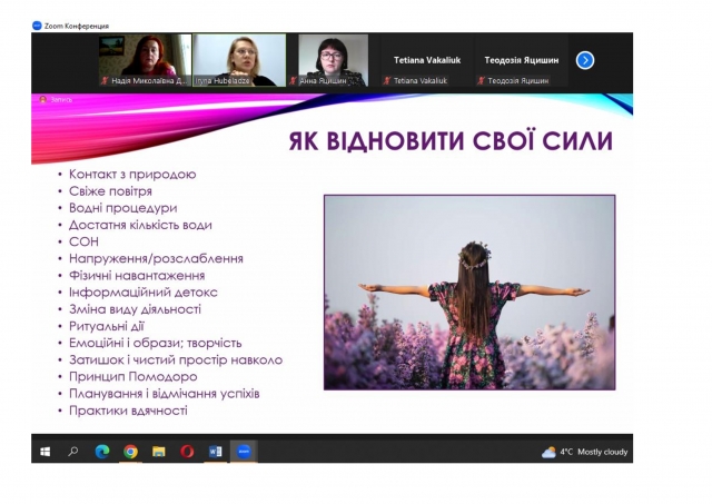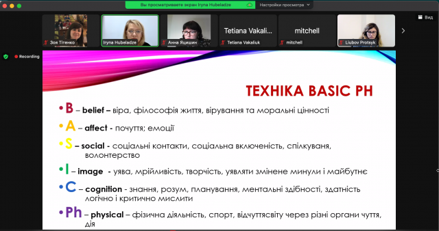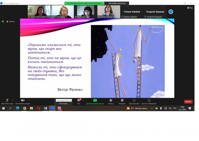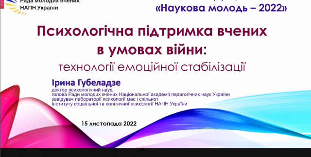 Дуже цікавими були запропоновані і проведені у форматі он-лайн практичні вправи для психологічної самодопомоги на основі впровадження принципів позитивного переконання. Підсумовуючи основні завдання психологічної підтримки вчених в умовах війни, лектор зазначила, що вони полягають, у правильному та своєчасному застосуванні технології емоційної стабілізації. Науковці та освітяни спроможні та зобов’язані актуалізувати свої творчі, інтелектуальні, особистісні, духовні можливості, які допоможуть їм вийти з кризового стану, спричиненими війною. Це спонукає до стимулювання самоповаги, впевненості в собі, придасть сили і наснаги для Перемоги і післявоєнної відбудови нашої славетної України!