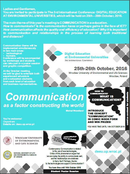 25-26 жовтня 2016 року у Вроцлавському природничому університеті (http://www.up.wroc.pl/en/ ) відбудеться ІІІ Міжнародна конференція Електронна освіта в природничих університетах.