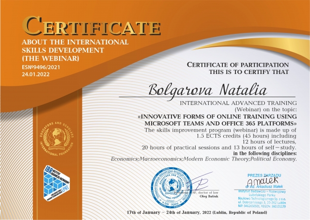 Викладачі кафедри економічної теорії НУБіП України доцент Болгарова Наталя Костянтинівна та доцент Гуща Інна Олександрівна взяли участь у Міжнародному підвищенні кваліфікації (Вебінарі) наукових, науково-педагогічних працівників ЗВО та працівників закладів освіти на тему: «Інноваційні форми онлайн навчання з використанням платформ Microsoft Teams та Office 365», яке відбулось 17-24 січня 2022 р. в онлайн режимі. (м. Люблін, Республіка Польща). Організатором міжнародного підвищення кваліфікації (Вебінару) були Інститут Науково-дослідний Люблінського науково-технологічного парку та IESF Міжнародна фундація науковців та освітян. Щиро дякуємо організаторам за цікавий матеріал!