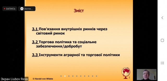 Незважаючи на свій тісний графік роботи під час візиту до нашого університету, почесний доктор НУБіП України, професор Гарольд фон Вітцке прочитав відкриту он-лайн лекцію на тему: «Необхідність ліберального торгового режиму для сучасного, високопродуктивного та інноваційного сільського господарства». Лекція одночасно читалась англійською мовою з перекладом українською та залучила широке коло студентів, магістрів, аспірантів і викладачів економічного факультету НУБІП України. Аспіранти спеціальності 076 «Підприємництво, торгівля та біржова діяльність» Андрій Благодатний, Владислав Крижній та Антон Тригубченко мали унікальний досвід познайомитись з методикою читання лекцій у іноземних ВНЗ. Основна увага на лекції була приділена проблематиці аграрної політики в країнах ЄС.