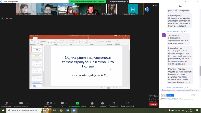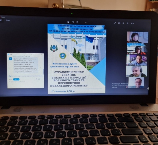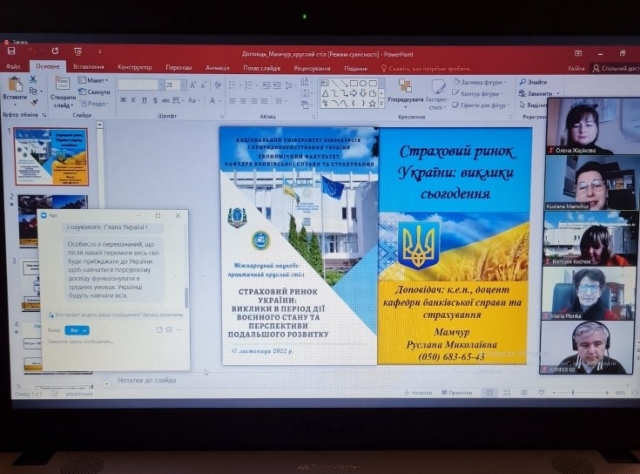 17 листопада 2022 р. на кафедрі Банківської справи та страхування відбувся Міжнародний науково-практичний круглий стіл «Страховий ринок України: виклики в період дії воєнного стану та перспективи подальшого розвитку». На цьому заході взяли участь студенти 1 курсу 1 групи спеціальності маркетинг”. Участь у відкритому столі брали Краківський економічний університет, Лодзький університет, Батумський державний університет ім. Ш. Руставелі, Університет менеджменту безпеки, Політехнічний коледж Їглава, Чеська Республіка Бухарестський економічний університет, Академія економічних наук Бухаресту, Національний НДІ праці та соціального захисту, Румунія, Луганський національний університет ім. Т. Шевченка Інститут післядипломної освіти та бізнес у Асоціація Страховий бізнес, студенти магістри, бакалаври 1, 2 і 3 курсів, гуртківці та викладачі.