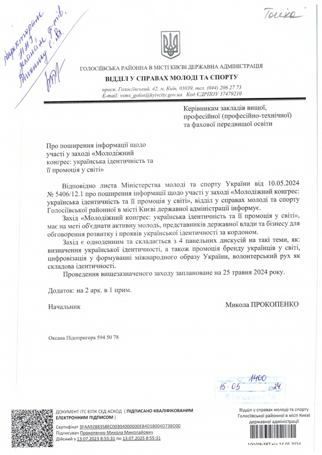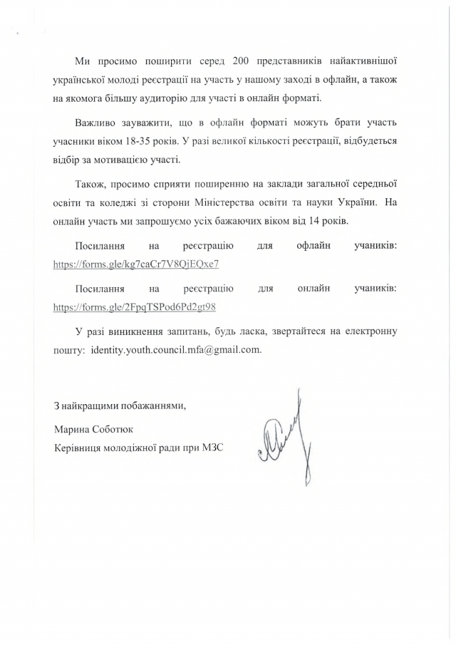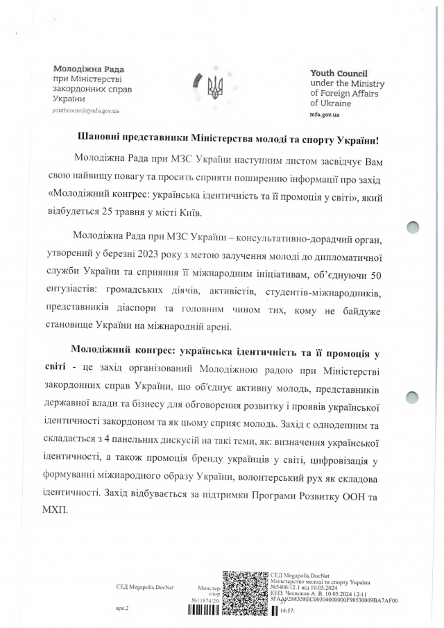 Молодіжна Рада при МЗС України запрошує до участі у заході "Молодіжний конгрес: українська ідентичність та її промоція у світі" 25 травня 2024 року 03:00 - 03:00