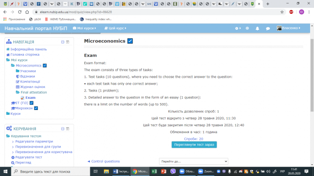 Проведення іспиту відбувалося в декілька етапів. Рівно в 11:30 студенти та члени комісії у складі: Власенко Юрій Григорович – к.е.н, доцент кафедри економічної теорії та Гуща Інна Олександрівна – к.е.н., доцент кафедри економічної теорії, зустрілися в онлайн засіданні для проведення інструктажу, переклички та обумовлення варіантів вирішення проблеми у разі можливого виникнення технічних недоліків роботи. Об 11:40 – студенти через свої особисті кабінети в системі Elearn розпочали складання іспиту, на який було виділено годину, після чого комісія приступила до перевірки екзаменаційних робіт. Час очікування був напруженим та хвилюючим. Після перевірки робіт була проведена співбесіда з використанням додатку Zoom, у якому можна без проблем під’єднати як звук, так і відео. На співбесіді стали відомі результати іспиту і всі були дуже задоволені ними.