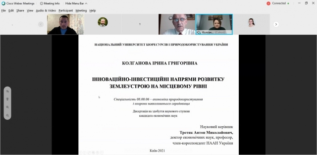 10 лютого 2021 р. на засіданні науково-технічної ради факультету землевпорядкування, яке відбувалося у дистанційному форматі, відбувся попередній захист дисертаційної роботи Колганової Ірини Григорівни на тему: «Інноваційно-інвестиційний напрямок розвитку землеустрою на місцевому рівні», поданої на здобуття наукового ступеня кандидата економічних наук.