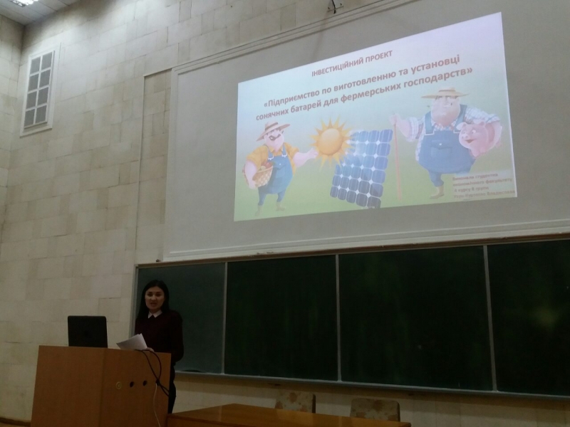 Борсукевич Вікторія представила інвестиційний проект виробництва продукції скотарства в Товаристві з обмеженою відповідальністю «Іванка». Основним джерелом фінансування даного проекту є кредитні кошти. З врахуванням всіх понесених витрат та прогнозованого прибутку, встановлено, що термін окупності проекту становить близько 5 років. Волянська Вікторія магістр першого року навчання винесла на розсуд комісії інвестиційний проект «Будівництва електростанції під зелений тариф». В межах даного дослідження доповідач запропонувала альтернативні шляхи фінансування даного проекту, а також зазначила важливість дослідження альтернативних джерел енергії.