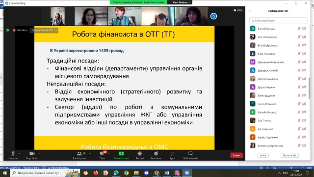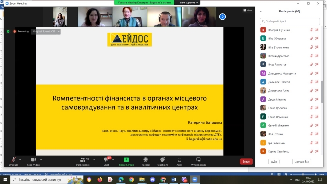 Про сучасні вимоги до фахівців – фінансистів в органах місцевого самоврядування та в аналітичних центрах розповіла к.е.н., фінансовий аналітик ГО «Центр Ейдос» Багацька Катерина Володимирівна. Доповідач окреслила особливості роботи фінансиста в ОТГ; компетентності фінансиста в аналітичному центрі та його ключові конкурентні переваги.