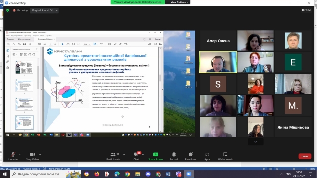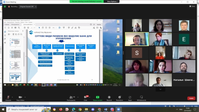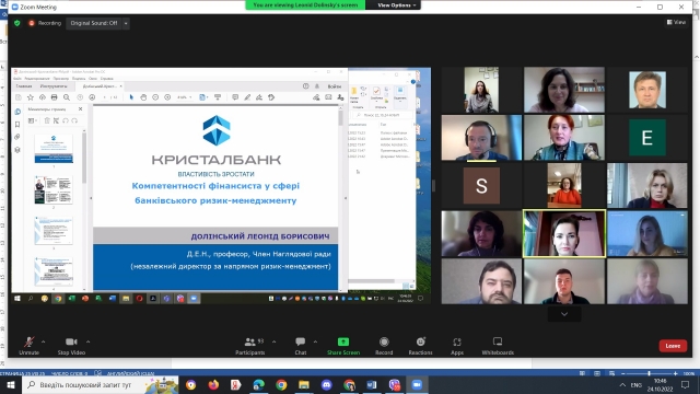 В умовах економічних дисбалансів, фінансової глобалізації та впровадження інноваційних форм банківського обслуговування значно зросла ймовірність настання банківських ризиків, що зумовлює пошук нових методів та форм для побудови ефективної системи внутрішнього контролю та ризик-менеджменту. Про компетентності фінансиста у сфері банківського ризик-менеджменту розказав д.е.н., член наглядової ради (незалежний директор за напрямом ризик-менеджмент) АТ «Кристалбанк» Долинський Леонід Борисович, а саме про сутність кредитно-інвестиційної банківської діяльності з урахуванням ризиків; роль органів управління банку; модель 3 ліній захисту у СВК; процес управління ризиками в АТ «Кристалбанк» та компетентності (знання, вміння, навички) фінансиста у сфері банківського ризик-менеджменту.