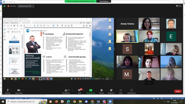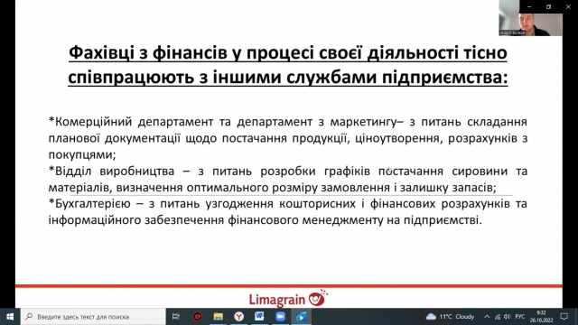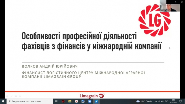 З особливостями професійної діяльності фахівців з фінансів у міжнародній компанії ознайомив спеціаліст – фінансист логістичного центру міжнародної аграрної компанії Limagrain Group та випускник кафедри фінансів Волков Андрій Юрійович. Він зазначив, що фахівці з фінансів у процесі своєї діяльності тісно співпрацюють з іншими службами підприємства, такими як комерційний департамент та департамент маркетингу; відділ виробництва, бухгалтерією та основні обов’язки фахівця з фінансів.