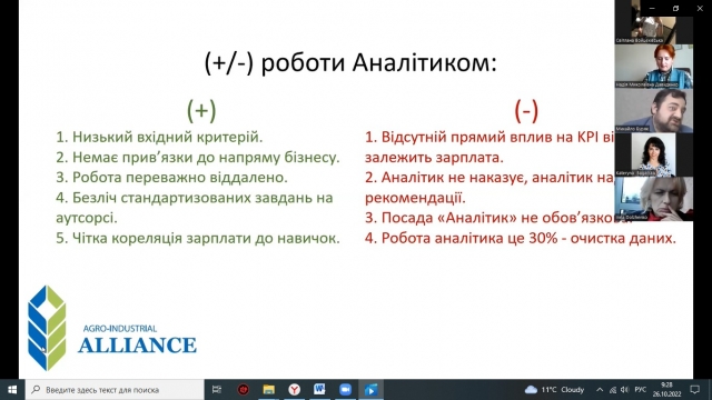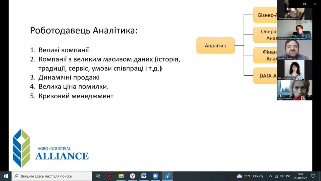 «Аналіз фінансової статистики допомагає ефективно керувати бізнесом, розподіляти ресурси компанії та заздалегідь передбачати ризики. Тому, в умовах ринкової економіки будь-якій компанії, що розвивається, потрібен фінансовий аналітик. Ця професія зараз дуже цінується бізнесом, але вона вимагає від фахівця глибоких знань та сучасних практичних навичок аналізу» - зазначає к.е.н., фінансовий аналітик консолідованої інформації відділу контролю відвантажень та доставок ТМЦ по регіонах України ГК «Агропромисловий альянс» Буряк Михайло Ігорович. У своєму виступі він вказав те, хто такий фінансовий аналітик та чим він займається; переваги та недоліки роботи аналітиком; технічні вимоги на ринку праці та необхідні професійні якості.
