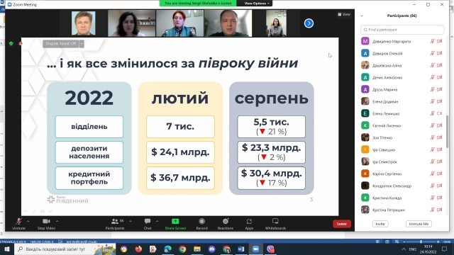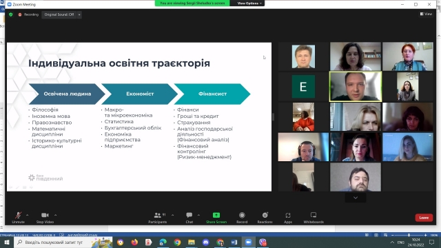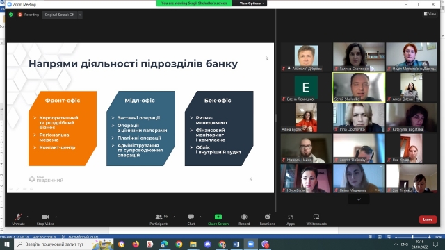 Банківська сфера – одна з найважливіших галузей у кожній країні. Саме від стабільної роботи фінансової системи та банків залежать добробут населення та його впевненість у майбутньому. Робота в банківській сфері престижна та надзвичайно відповідальна, адже вона пов’язана не лише з фінансами, а й з довірою людей. Саме довіра є ключовою в роботі кожного банку. А будувати стабільні, довгострокові та взаємовигідні стосунки з клієнтами можуть лише висококваліфіковані банківські спеціалісти. Ключові навички сучасного банківського працівника розкрив головний фахівець департаменту оцінки та заставних операцій ПАТ Акціонерний банк "Південний" Шелудько Сергій Андрійович. У своїй доповіді він акцентував увагу на змінах, які відбулися у банківській сфері за період 2017 – 2022 рр., та відповідно вимог до потенційних працівників; основних напрямах діяльності підрозділів банку; окреслив основні знання і вміння працівника сучасного банку та індивідуальну освітню траєкторію.