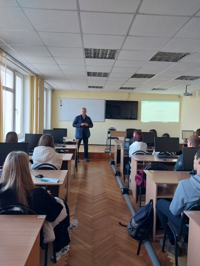 Детальніше про освітню програму «Аналітичне і обліково-правове забезпечення бізнесу» розповів завідувач кафедри статистики та економічного аналізу Андрій Музиченко, запросивши школярів у лабораторію біоеконометрики та дейтамайнінгу. Він наголосив на затребуваності професії аналітика на ринку праці та проаналізував складові навчального процесу освітньої програми кафедри.
