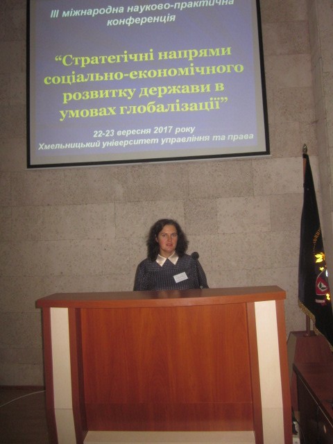 Міжнародна науково–практична конференція «Світові тенденції та перспективи розвитку фінансової системи України», м. Київ, 28-29 вересня 2017 р.; ІIІ Міжнародній науково-практичній конференції: «Стратегічні напрями соціально-економічного розвитку держави в умовах глобалізації», м. Хмельницький, 22-23 вересня 2017 р. IV Міжнародній науково-практичній конференції: «Механізми, стратегії, моделі та технології управління економічними системами за умов інтеграційних процесів: теорія, методологія, практика», м. Хмельницький, 6-8 жовтня 2017 р.