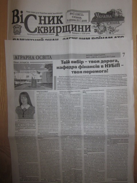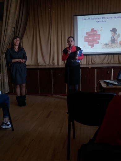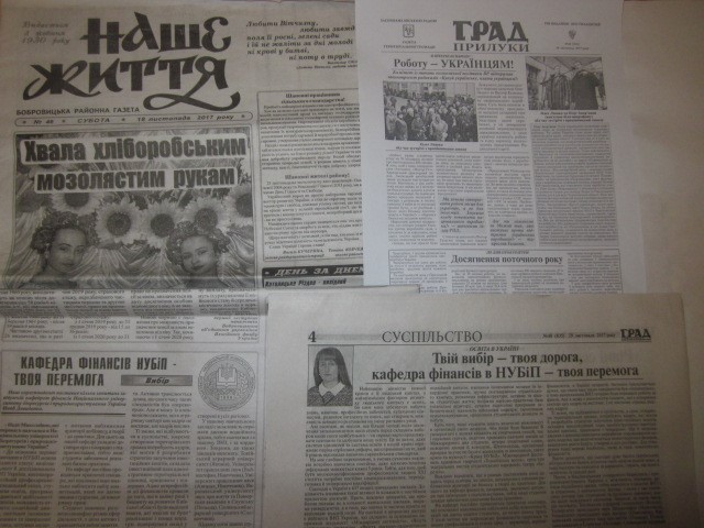 В рамках тижня Фінансової грамотності кафедрою фінансів було проведено ознайомлення учнів із сучасними фінансовими продуктами та послугами, а також основами фінансового планування Завідувач кафедри проф. Давиденко Н.М. провела ряд зустрічей із кореспондентами районних газет, де розміщено її інтерв’ю, загальний тираж видань складає понад 21 тис. примірників.