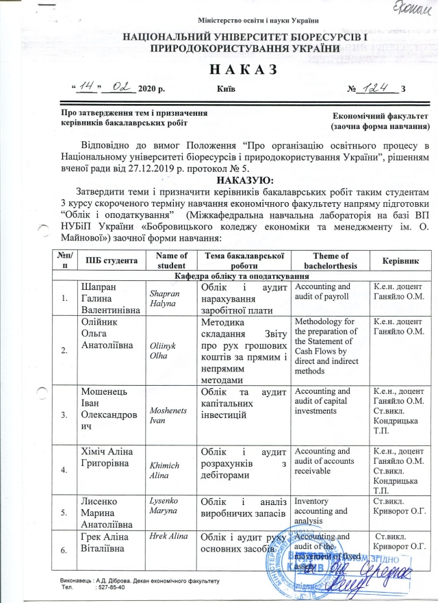 НАКАЗ про призначення тем і керівників бакалаврських робіт ЗФН, 2019-20 н.р._МНЛ "Бобровицький коледж економіки та менеджменту" 30 березня 2020 року 03:00 - 03:00