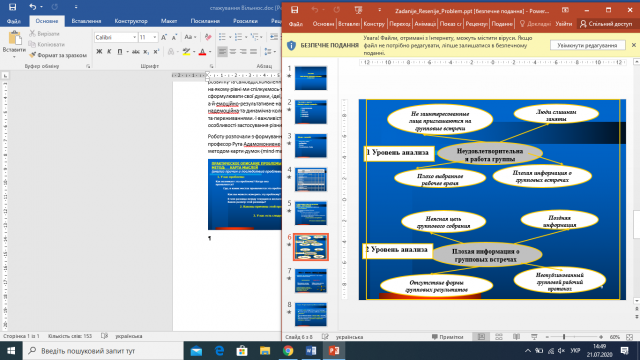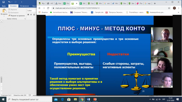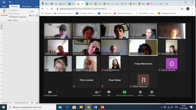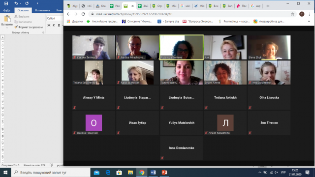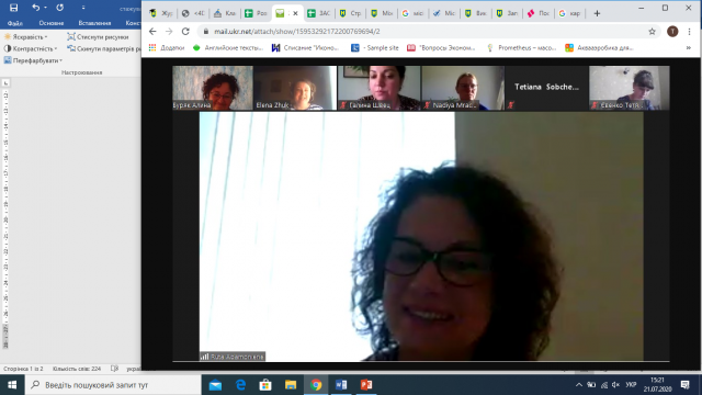 Сьогоднішня робоча он-лайн зустріч показала, що викладацька професійна умілість, відкритість, легкість у прийнятті рішень та жага до нових відкриттів, долає всі перепони (карантинні, технічні, територіальні). Практична колективна робота пройшла у надзвичайно теплій, дружній, фаховій атмосфері, що дозволило не лише закріпити набуті навики роботи з методами оцінки командної роботи та розкрити висвітлені питання, а й дала можливість колегам поспілкуватись та намітити орієнтири подальшої співпраці.
