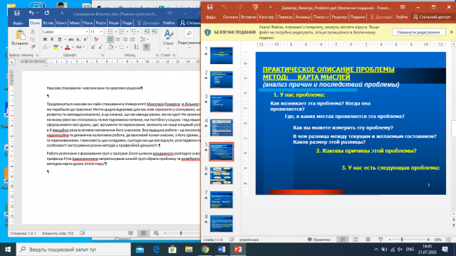 Роботу розпочали з формування груп у програмі Zoom шляхом рондомного розподілу учасників. Далі професор Рута Адамомониене запропонувала кожній групі обрати проблему та розібрати її за методом карти думок (mind map).
