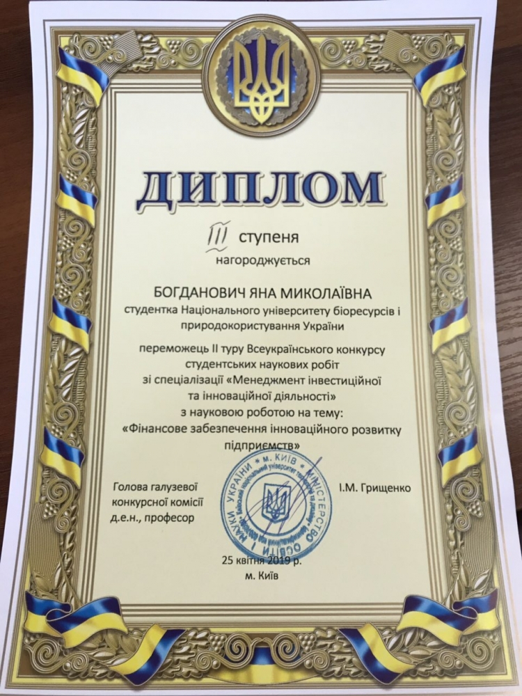 Історично травень місяць вважається місяцем свят та передчуття кінця навчального року і відпочинку. Але не дивлячись на це активних подій на кафедрі фінансів було вдосталь. Вже не перший рік кафедра фінансів приймає участь у численних олімпіадах та конкурсах наукових робіт. Так і цього року у КНУТД відбувся заключний етап Всеукраїнського конкурсу студентських наукових робіт із спеціальності «Менеджмент інвестиційної та інноваційної діяльності», на якому наша студентка Богданович Яна під керівництвом професора Давиденко Надії підготувала наукову роботу та отримала диплом ІІІ ступеню, а керівник відзначена почесною грамотою переможця ІІ туру.