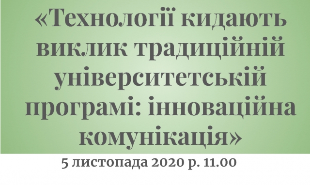 5 листопада 2020 року 11.00 – 14.00, в онлайн форматі відбулася студентська наукова конференція «Технології кидають виклик традиційній університетській програмі: інноваційна комунікація» в рамках дисципліни «Українська мова за професійним спрямуванням». Учасників першої студентської он-лайн конференції привітали керівники факультетів: Ружило Зіновій Володимирович кандидат технічних наук, доцент; Братішко Вячеслав В’ячеславович, доктор технічних наук, старший науковий співробітник; Сівак Ігор Миколайович, кандидат технічних наук, доцент. Зареєструвалося понад 200 першокурсників-учасників.