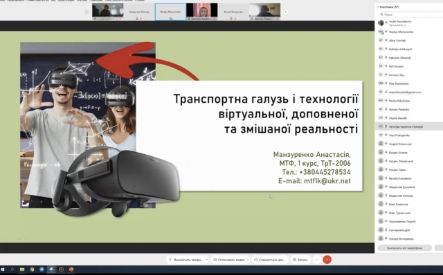 Студенти групи ТТ-2006 підготували тематичний блок: Манзуренко Анастасія "Складання шляху " від виробника до споживача" за допомогою технологій віртуальної, доповненої та змішаної реальності"; Куций Владислав – "Віртуальна реальність у навчанні"; Маляров Нікіта – " Ефективність транспортної логіки як складової логістичної системи"; Криськов Владислав – "Віртуальна реальність як технологія навчання"; Гущенко Владіслав – "Вантажні перевезення"; Стахов Андрій – "Доповнена реальність, як новий спосіб конструювання машин та інших механізмів"; Лазаренко Богдан – "Smart перевезення"; Корж Назарій – "Віртуальна реальність у промисловості"; Андріяшевський Віталій – "Технології віртуальної та доповненої реальності у сфері автоперевезень... та багато інших цікавих тем за фахом, оставте правило 1) ексклюзивність теми, 2) дотримання плану і регламенту он-лайн роботи. Стрімка діджиталізація сучасного світу, поява нових професій і методів навчання – це виклики для традиційної системи освіти. Наші студенти орієнтовані на гнучкість у пристосуванні до реалій сьогодення. Час першокурсникам опанувати нові технології, це перша конференція як освітня платформа сучасного зразка дистанційного навчання – Ukraine Smart School надає можливість студентам технічних дисциплін консолідувати свої доповіді у smart-спільноту.