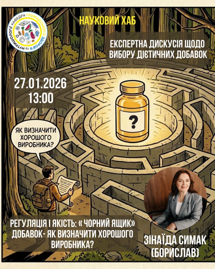 Запрошуємо вас на онлайн-зустріч у межах Наукового хабу, щоб разом із провідною експерткою Зінаїдою Симак (Борислав) відкрити цей «чорний ящик» і навчимося обирати лише перевірене. Під час експертної дискусії ми детально розберемо питання регуляції ринку та дізнаємося, як розпізнати надійного виробника дієтичних добавок. Ви отримаєте практичні інструменти, які допоможуть не стати жертвою агресивного маркетингу та зберегти своє здоров’я.